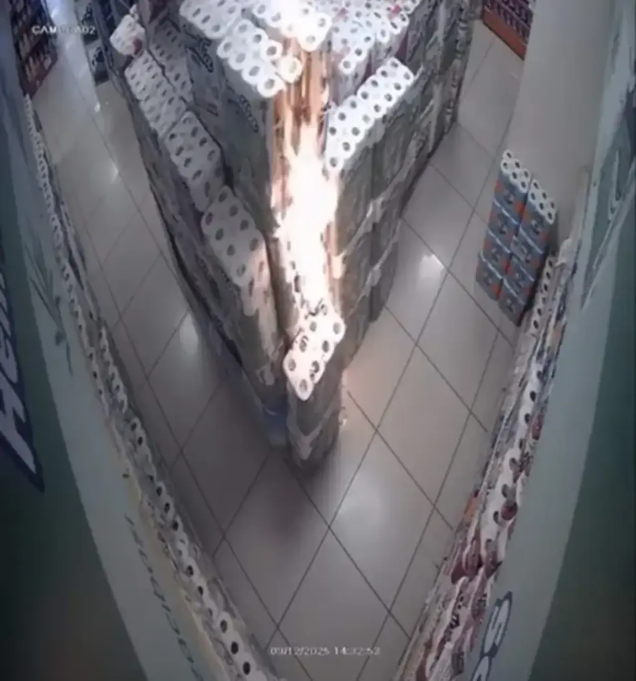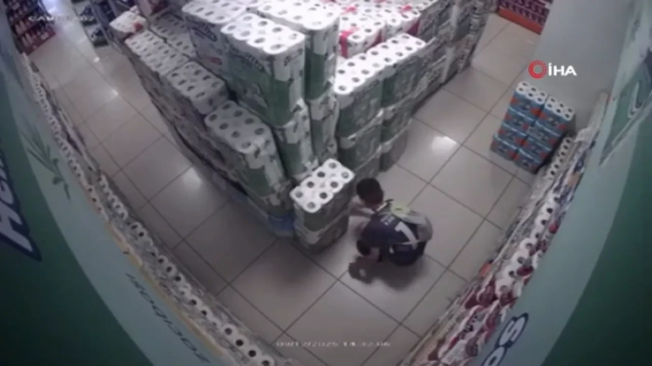 Zincir marketin bir şubesine gelen çocuk, peçetelerin bulunduğu reyondaki bir etiketi kopardı. Çakmakla tutuşturduğu etiketi ürünlerin arasına bırakan çocuk, koşarak marketten uzaklaştı. Peçetelerin kısa sürede alev almasıyla reyonu dumanlar kapladı.
