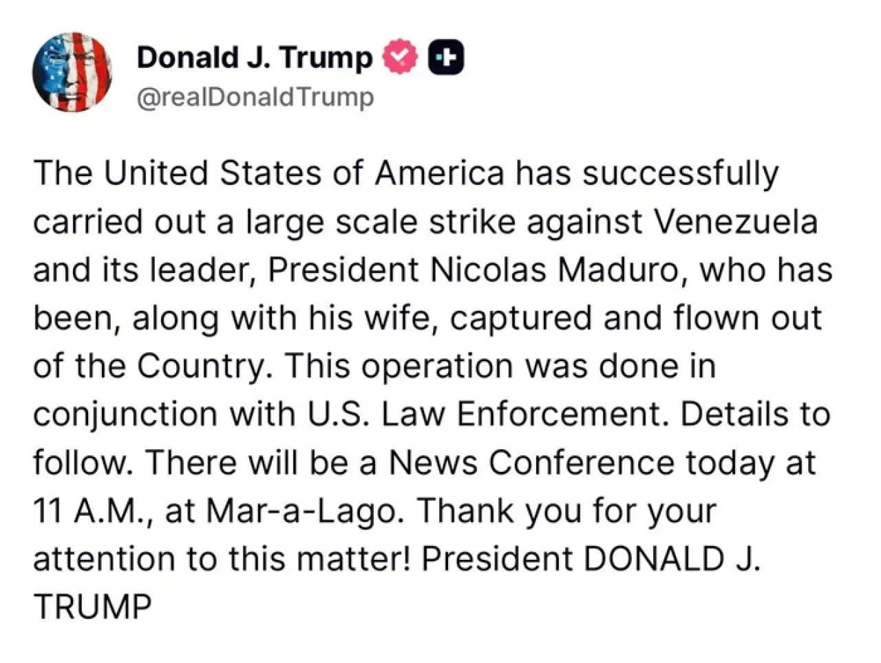 “Amerika Birleşik Devletleri, Venezuela’ya ve ülkenin lideri Devlet Başkanı Nicolas Maduro’ya yönelik geniş çaplı bir operasyonu başarıyla gerçekleştirmiştir. Maduro ile birlikte eşi de yakalanarak ülke dışına çıkarılmıştır. Bu operasyon, ABD kolluk kuvvetleriyle koordinasyon içinde yürütülmüştür. Ayrıntılar daha sonra paylaşılacaktır. Bugün saat 11.00’de Mar-a-Lago’da bir basın toplantısı düzenlenecektir. Bu konuya gösterdiğiniz ilgi için teşekkür ederim.”