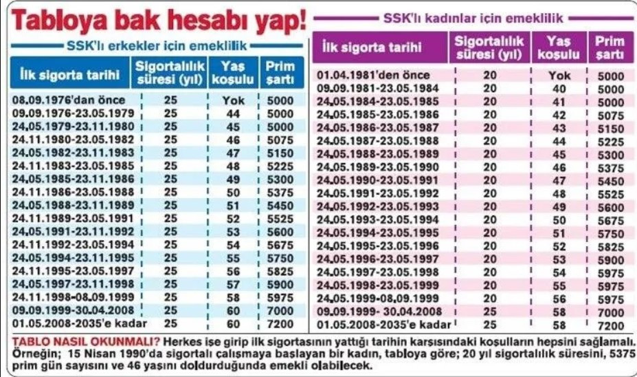 EMEKLİLİK YAŞ YIL TABLOSU HESAPLAMA! KADINLAR VE ERKEKLER İÇİN EMEKLİLİK YAŞI KAÇ, KİM NE ZAMAN EMEKLİ OLACAK?