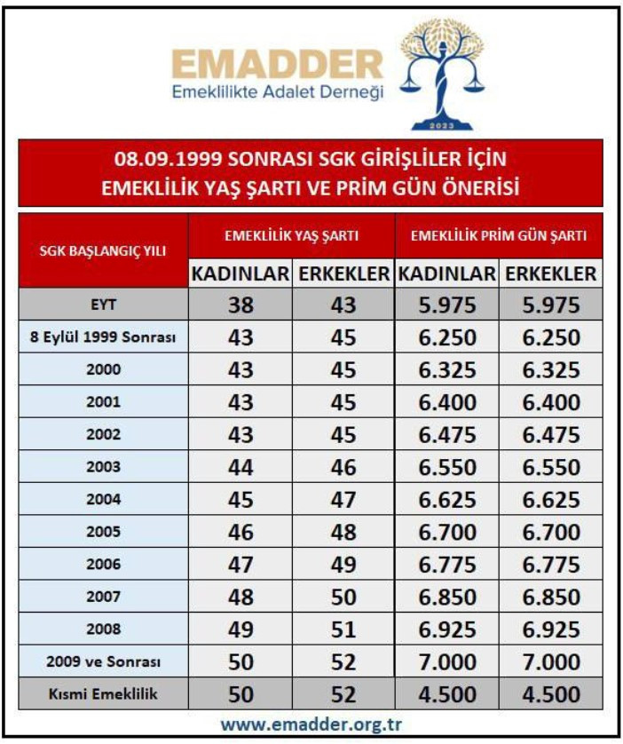 EMADDER EMEKLİLİKTE ADALET DERNEĞİ EMEKLİLİK YAŞ ŞARTI VE PRİM GÜN ÖNERİSİ TABLOSU!