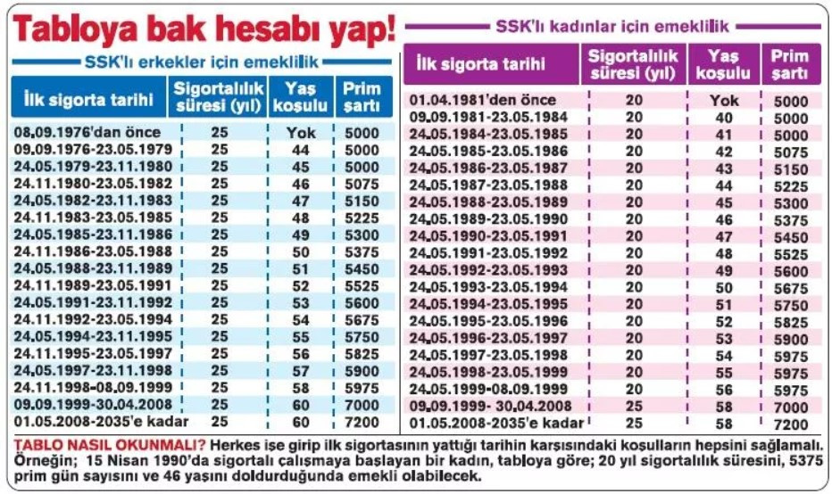 8 Eylül 1999 ve 2000 arası işe girişi olan kişiler 6.250 prim gün şartı ile kadınlarda 43 erkeklerde 45 yaş şartı ile,