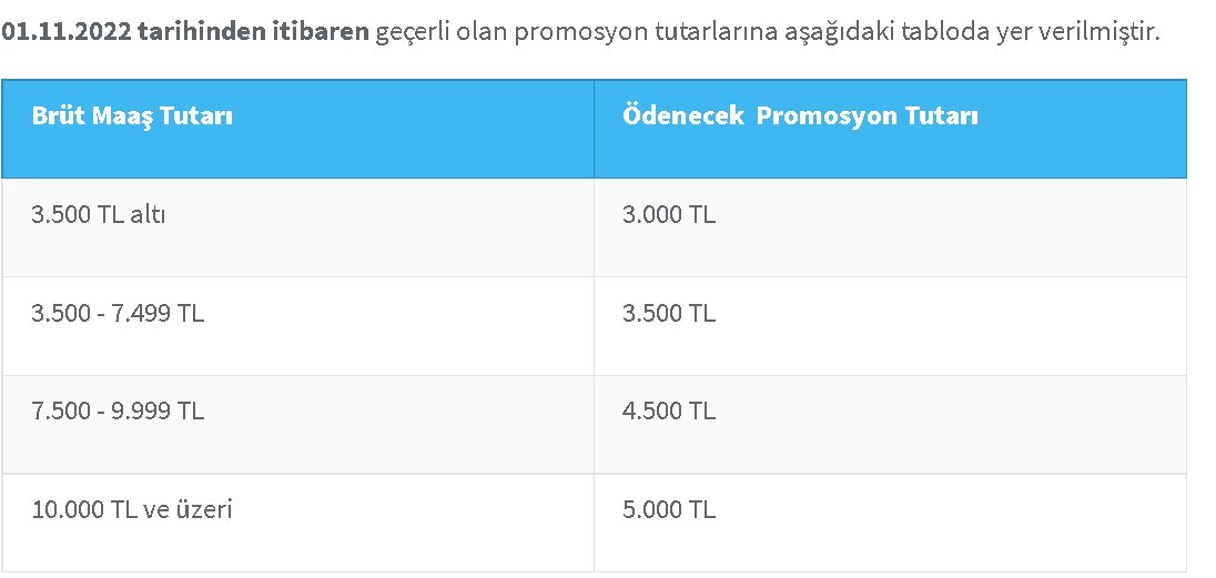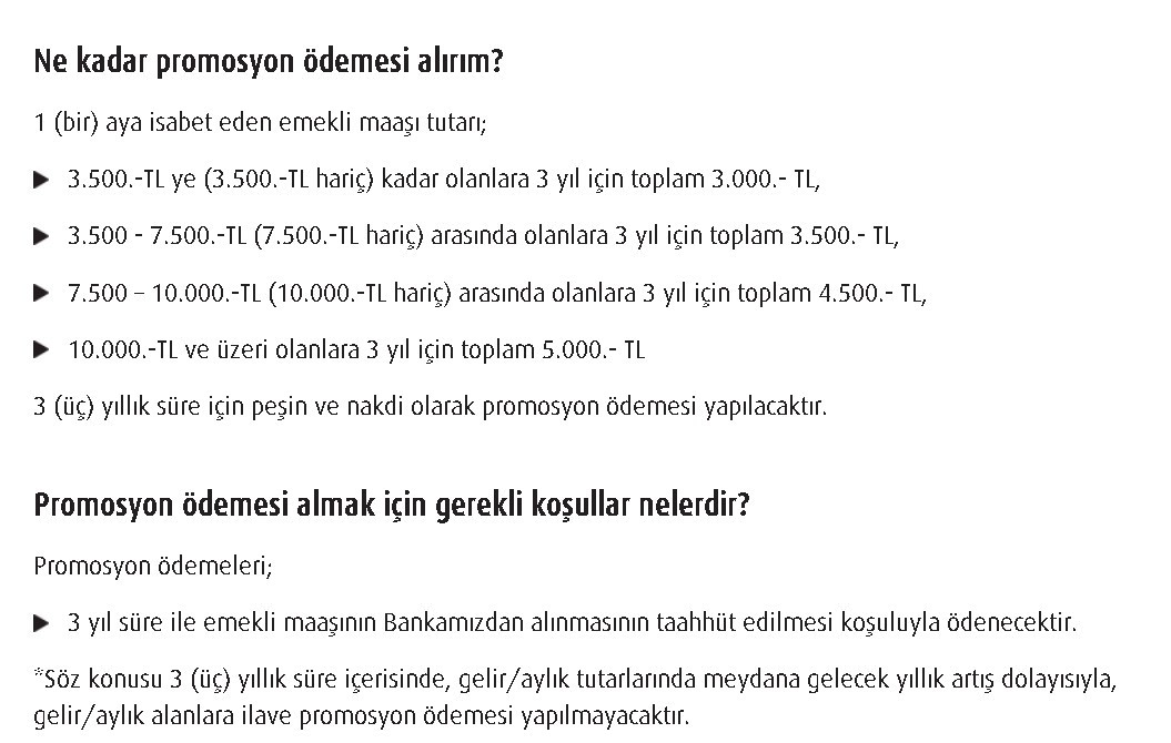 10.000.-TL ve üzeri olanlara 3 yıl için toplam 5.000.- TL promosyon ödemesi yapacak.