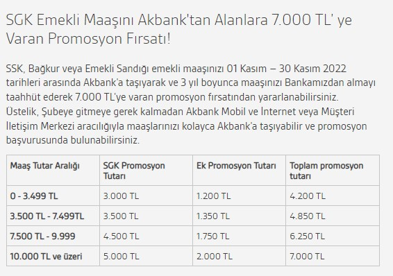 Promosyon yarışını başlatan ilk banka olan Akbank tüm bankaların 2 bin TL promosyon verdiği dönemde yaptığı rekor artış ile promosyonda fırtına esmesine neden olmuştu. 1 Kasım 2022 tarihi itibari ile promosyon rakamlarını güncelleyen Akbank emeklilere en yüksek promosyon rakamını 7 bin TL olarak belirledi.