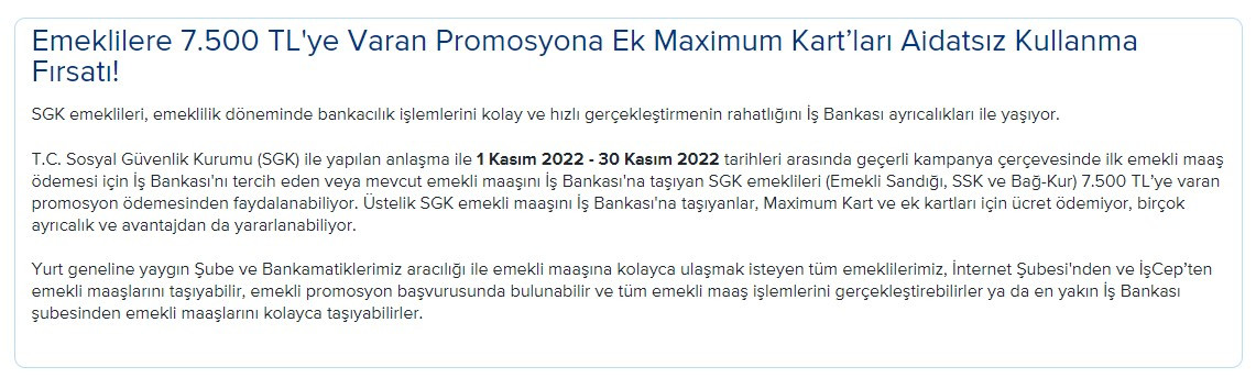 İş Bankası emekli maaşı müşterilerine 7 bin 500 liraya varan promosyon ödemesi imkanı sunarken promosyon tutarına ek olarak Maximum Kredi Kartı alan emeklilere aidatsız kullanma fırsatı sunulacak.