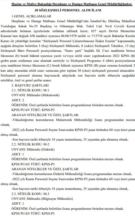 Darphane işçi alımı için beklenen duyuru 7 Kasım 2022 tarihli Resmi Gazete ile yayımlandı. Yayımlanan ilan kapsamında Hazine ve Maliye Bakanlığı Darphane ve Damga Matbaası Genel Müdürlüğün mühendis, tekniker, yazılımcı ve büro personeli olmak üzere farklı kadrolarda personel alımı başvurusu başladı.