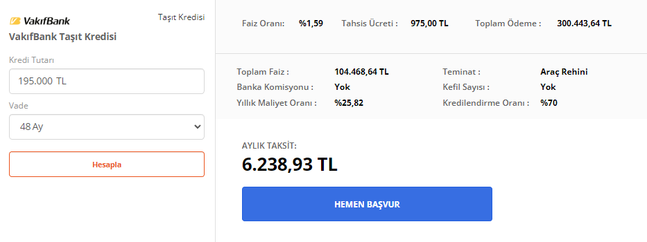 Vakıfbank'ın sunmuş olduğu 195 bin TL tutarındaki taşıt kredisi ile satın aldıkları aracın yarı fiyatını kredilendirerek ödeyecekler. Vakıfbank tarafından sunulmuş olan 195 bin TL tutarındaki taşıt kredisinin detayları ise şu şekilde;