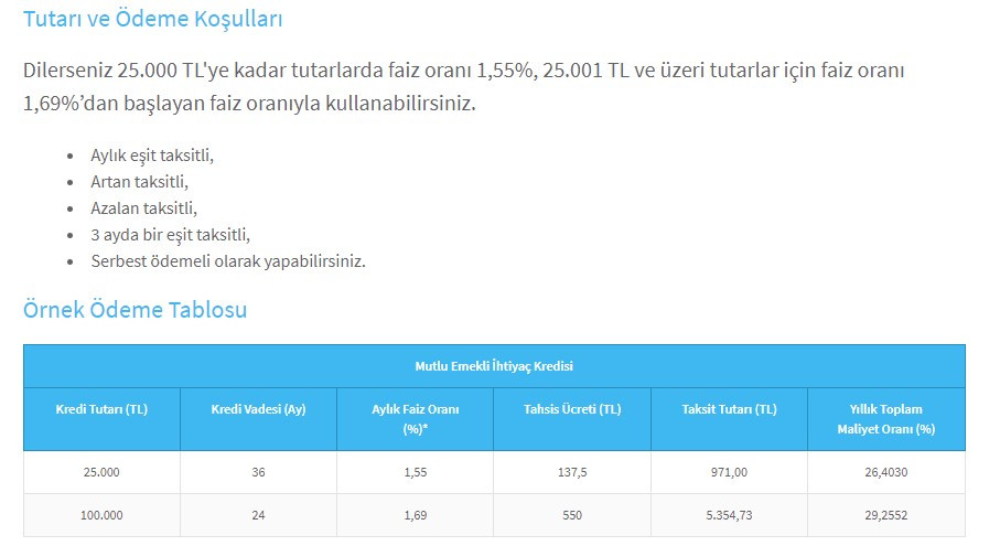 Halkbank tarafından başlatılan kredi paketi için yapılan açıklamada "Maaşını Bankamızdan alan veya maaşını Bankamıza aktarmayı taahhüt eden emekli müşterilerimizin tüm nakit ihtiyaçları için cazip faiz oranları ve uygun geri ödeme seçenekleriyle 100.000 TL'ye kadar sunduğumuz bireysel kredi ürünümüzdür" denilerek emekli maaşını Halkbank şubesine taşıyan ya da alan kişilere özel kredi paketi sunuldu. Halkbank emeklilere özel ihtiyaç kredisi paketinde aylık faiz oranı ise 25 bin liraya kadar olan kredi paketleri için yüzde 1, 55 ve daha yüksek olan kişiler için ise yüzde 1, 69 olarak belirlendi.