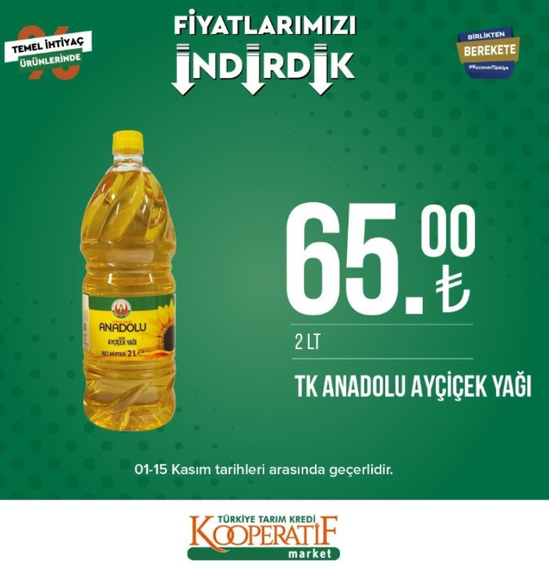 Yayımlanan yeni katalog ile 15 Kasım 2022 tarihine kadar indirimli olan ürünler ilan edilirken Cumhurbaşkanı Erdoğan tarafından verilen talimatla uzun bir aradan sonra ayçiçek yağı fiyatı da düştü. Tarım Kredi Marketler Anadolu Ayçiçek Yağı 2 LT satış fiyatı 65 TL olarak ilan edildi. Söz konusu fiyat 15 Kasım 2022 tarihine kadar geçerli olacak. Yine indirim stoklarla sınırlı tutulacağı için alışveriş yapmak isteyen kişilerin ihtiyaçları bulunuyorsa ellerini hızlı tutmaları gerekiyor. Ayçiçek yağının yanı sıra un, toz şeker, çay, yumurta, beyaz peynir ve tereyağı gibi pek çok üründe de indirimler bulunuyor.