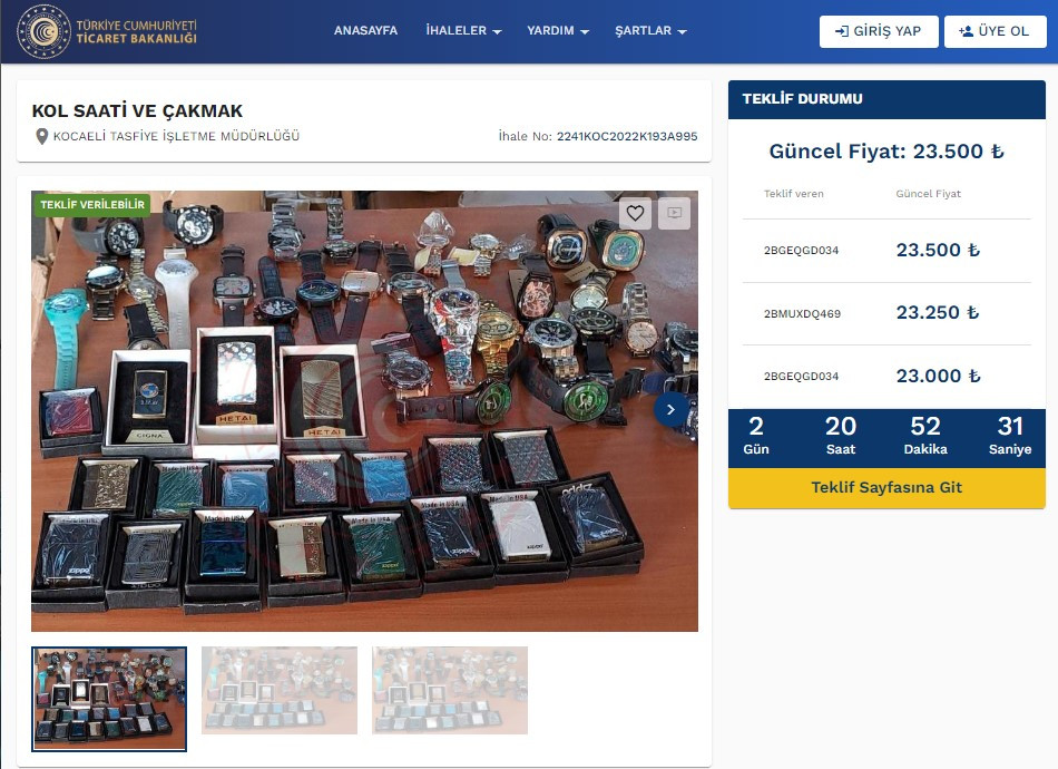 Pek çok vatandaşın yalnızca otomobil ilanları için tercih etmekte olduğu T. C. Ticaret Bakanlığı resmi ihale adresinde aynı zamanda eşyalar da satışa sunuluyor. Gelen yeni bir ilan kapsamında çok sayıda kol saati ve çakmağın satışa sunulması dikkat çekti.