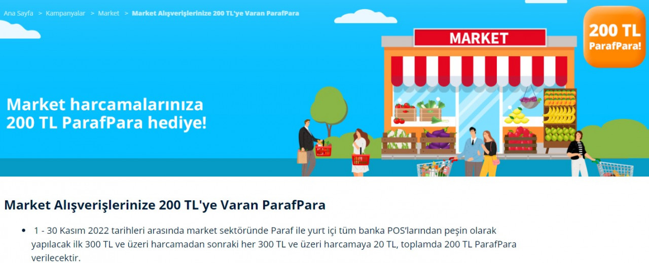 30 Kasım 2022 tarihine kadar yapılan market harcamaları için başlatılan kampanya kapsamında tüm banka POS'larından peşin olarak yapılacak olan 300 TL ve üzeri her alışverişte 20 TL olmak üzere sonraki her alışverişinizde de 20 TL olmak üzere toplamda 200 liraya kadar Paraf Para kazanma imkanı sunulacak. Kampanyadan katılmak isteyen kişilerin Paraf Kart sahibi olmaları ve alışveriş yapmadan önce kampanyaya katılım sağlamaları yeterli olacak. Paraf Mobil ve internet sitesi üzerinden başvuru yapılabilecek.