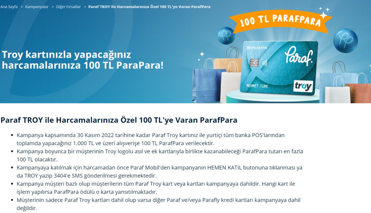 Troy kartla yapılan alışverişler için düzenlenen özel kampanyada 30 Kasım 2022 tarihine kadar yapılacak olan alışverişlerde hediye para yüklemesi yapılıyor. Kampanya kapsamında 30 Kasım 2022 tarihine kadar Paraf Troy kartınız ile yurtiçi tüm banka POS'larından toplamda yapacağınız 1.000 TL ve üzeri alışverişe 100 TL Paraf Para yüklemesi yapılacak. Yine kampanyadan yararlanmak isteyen kişilerin alışveriş yapmadan önce Paraf Mobil uygulaması üzerinden kampanya katılım butonuna basması yeterli olacak. Kampanyaya katılan kişileri bin liralık harcamaları karşısında 100 liralık paraf para ödülü kazanmış olacaklar.