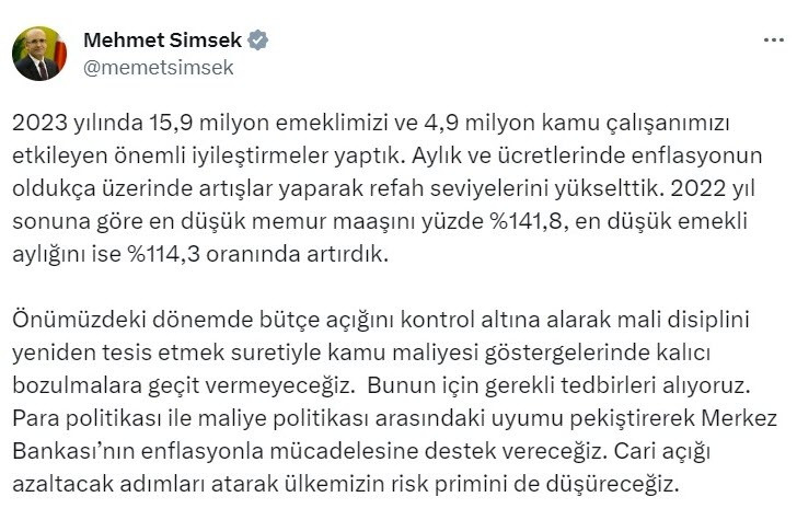 Hazine ve Maliye Bakanı Mehmet Şimşek, sosyal medya hesabından 2023 yılında 15, 9 milyon emekliye ve 4, 9 milyon kamu çalışanına önemli iyileştirmeler yaptıklarını açıkladı.