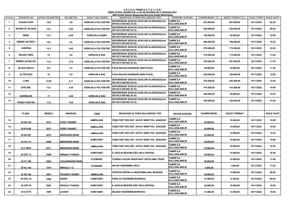 İzmir Çevre, Şehircilik ve İklim Değişikliği İl Müdürlüğü Milli Emlak Dairesi Başkanlığı Bornova Emlak Müdürlüğü tarafından yayımlanan ihale duyurusu ile tamir ile kullanılabilir durumda olan çok sayıda tekne satışa çıktı. Satışa sunulan teknelerin satış fiyatları ise en düşük 50 bin TL ve en yüksek 870 bin TL arasında değişiyor.