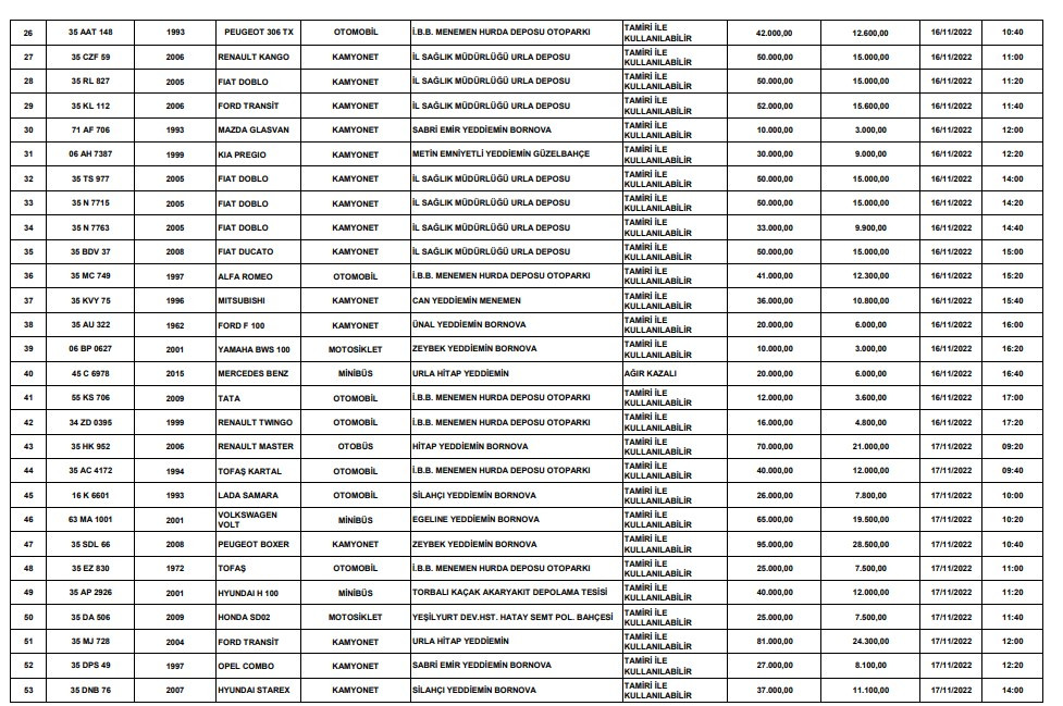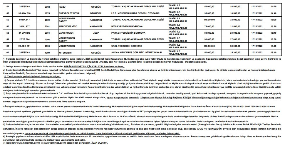 Ambulans, otobüs, kamyonet, otomobil, minibüs ve motosiklet olmak üzere çok sayıda taşınır mal ilanları da yayımlandı ve alım yapmak isteyen kişiler için büyük fırsat sunuldu. Araçların satış ihaleleri, 2886 sayılı Devlet İhale Kanununun 45. Maddesine göre Açık Teklif Usulü ile tahmini bedel üzerinden İzmir Çevre, Şehircilik ve İklim Değişikliği İl Müdürlüğü Milli Emlak Dairesi Başkanlığı Bornova Emlak Müdürlüğünde (Anadolu cad. No 41/2 kat 3 Bayraklı İzmir) teşekkül edecek komisyon huzurunda yapılacak.