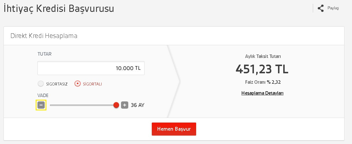 Müşterilerine hazır kredi limiti hizmeti sunan bir diğer banka olan Yapı Kredi Bankası nakit para ihtiyacı olan müşterilerine 50 bin liraya kadar anında kredi veriyor. 36 ay vadeli 10 bin TL kredi çeken kişilerin aylık taksit ödemesi ise 523, 39 TL olarak gerçekleşiyor. Kredi çekmek isteyen kişilerin krediler bölümünde yer alan hazır kredi limitlerini hesaplarına aktarma butonuna basmaları yeterli oluyor.