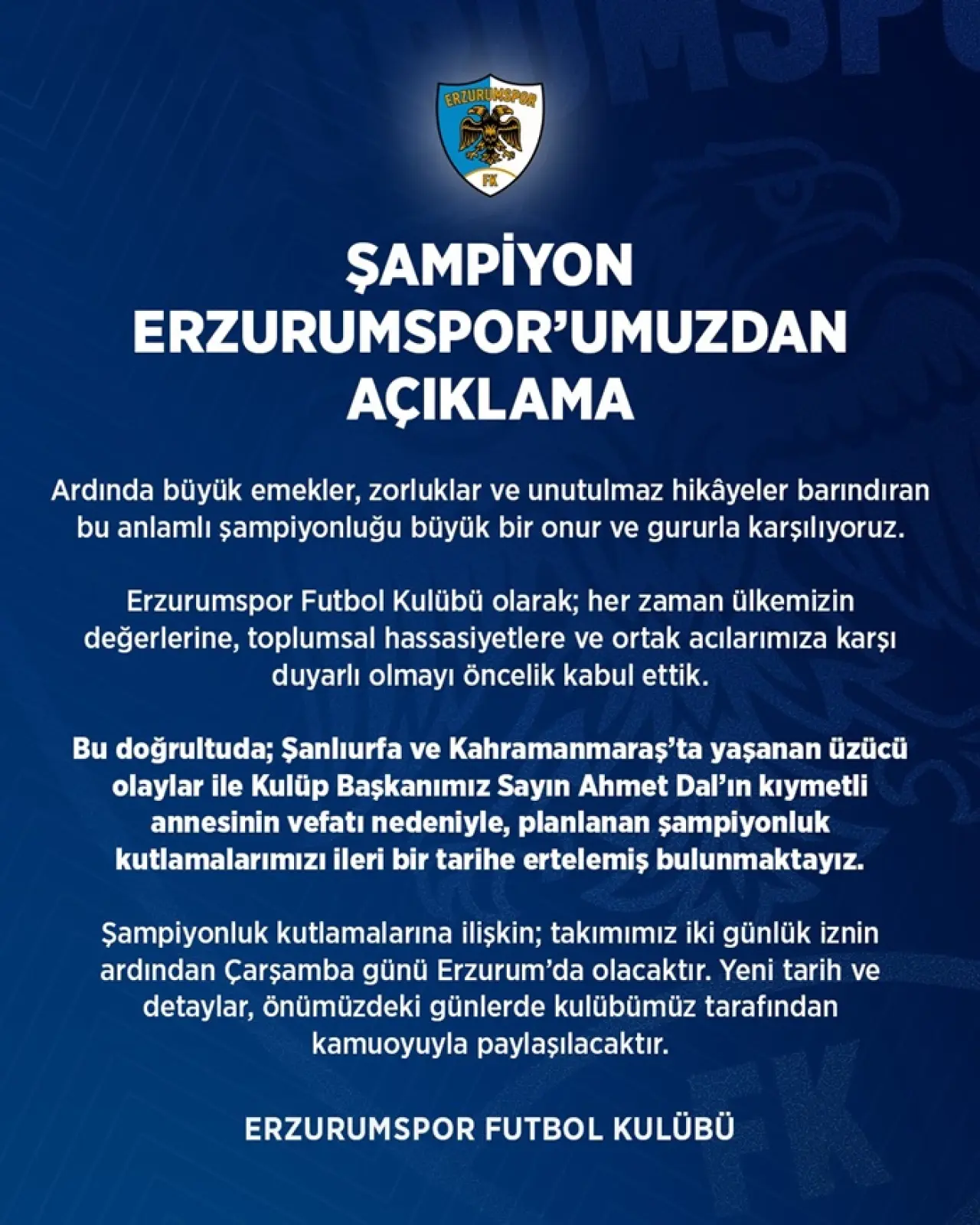 Açıklamada, “Erzurumspor Futbol Kulübü olarak, her zaman ülkemizin değerlerine, toplumsal hassasiyetlere ve ortak acılarımıza karşı duyarlı olmayı öncelik kabul ettik. Bu doğrultuda, Şanlıurfa ve Kahramanmaraş'ta yaşanan üzücü olaylar ile kulüp başkanımız Sayın Ahmet Dal'ın kıymetli annesinin vefatı nedeniyle, planlanan şampiyonluk kutlamalarımızı ileri bir tarihe ertelemiş bulunmaktayız.” ifadelerine yer verildi.