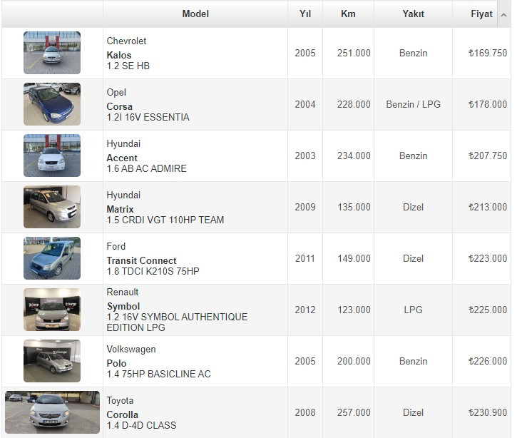İkinci el araba sahibi olmak istiyorum diyen kişilere yönelik olarak şu anda sitede yüzlerce satılık araba ilanı yer alırken en düşük araç fiyatı ise 169 bin 750 TL'den başlıyor. Araçların fiyatları satın alınmak istenen marka, model, araç özellikleri, donanım paketi ve km'sine göre belirlenirken farklı bütçelere hitap edecek çok sayıda modelde sitede yer alıyor. 2008 model Toyota Corolla satış fiyatı 230 bin TL olarak yer alırken 2005 model Volkswagen Polo ise 226 bin liraya alıcısını bekliyor.