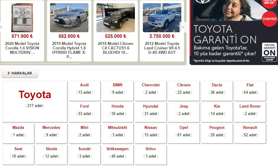 Toyota satılık 2.el araç ilanları yayımlanırken farklı pek çok markaya ilişkin yeni fiyatlarda belli oldu. Toyota'nın resmi internet sitesi üzerinden yayımlanan ilanlar yoğun ilgi görürken Toyota markasına ait olan 216 adet farklı model 2. el araç ilanı satışa çıktı. Bunlara ek olarak Ford, Renault, Peugeot, Mercedes, Honda, Hyundai, Citroen, Dacia ve Volkswagen gibi Türkiye'nin en çok satan araba modellerine de yer verildi.