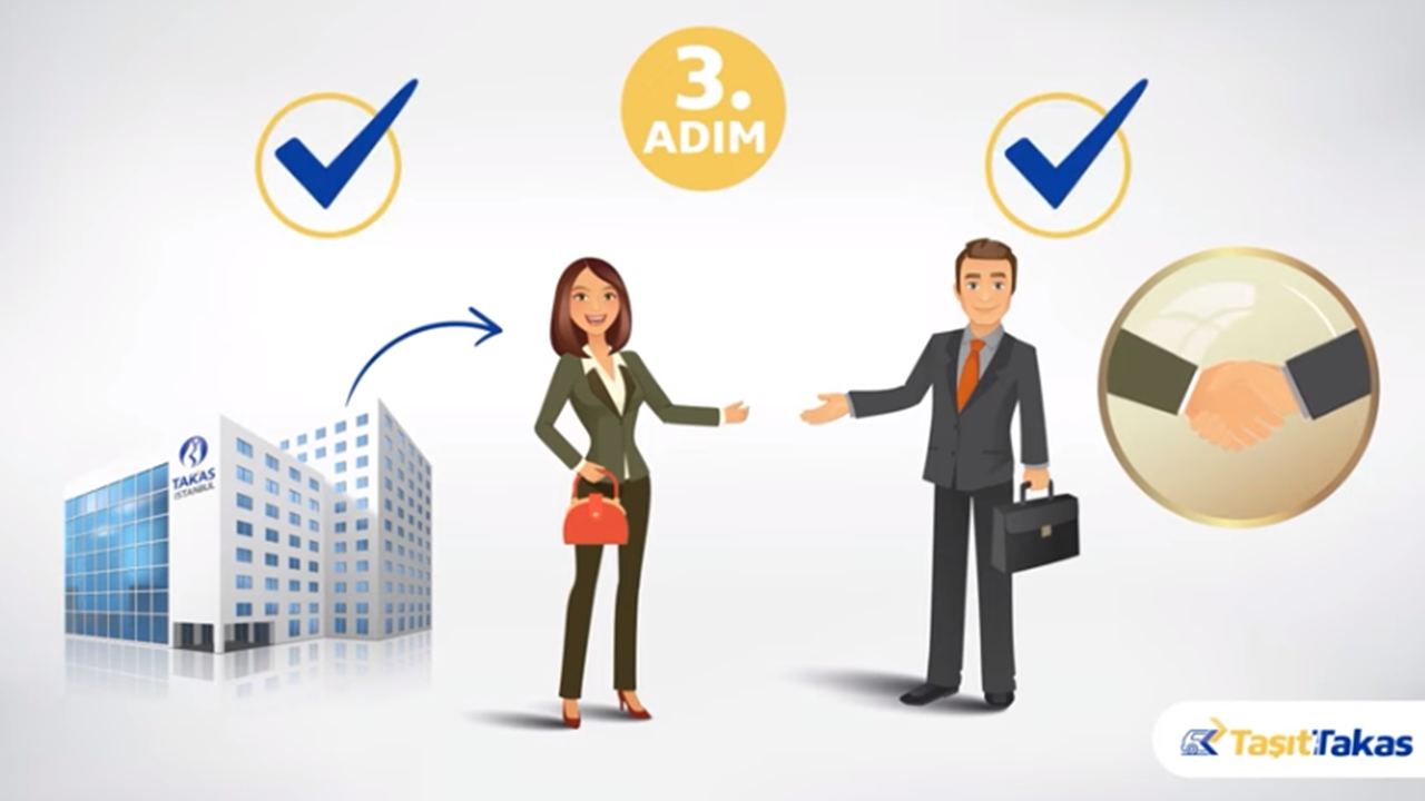 - Alıcı ve satıcı, www.turkiye.gov.tr/www.tasittakas.com.tr adreslerinden veya TaşıtTakas mobil uygulamasından sisteme girer ve gerekli bilgileri doldurur. Sistem alıcı ve satıcıyı eşleştirir.