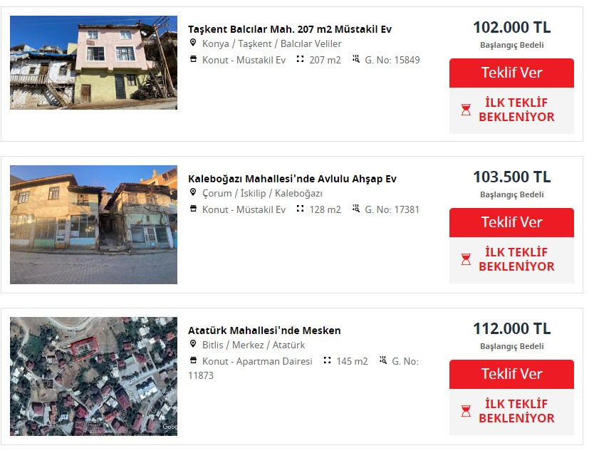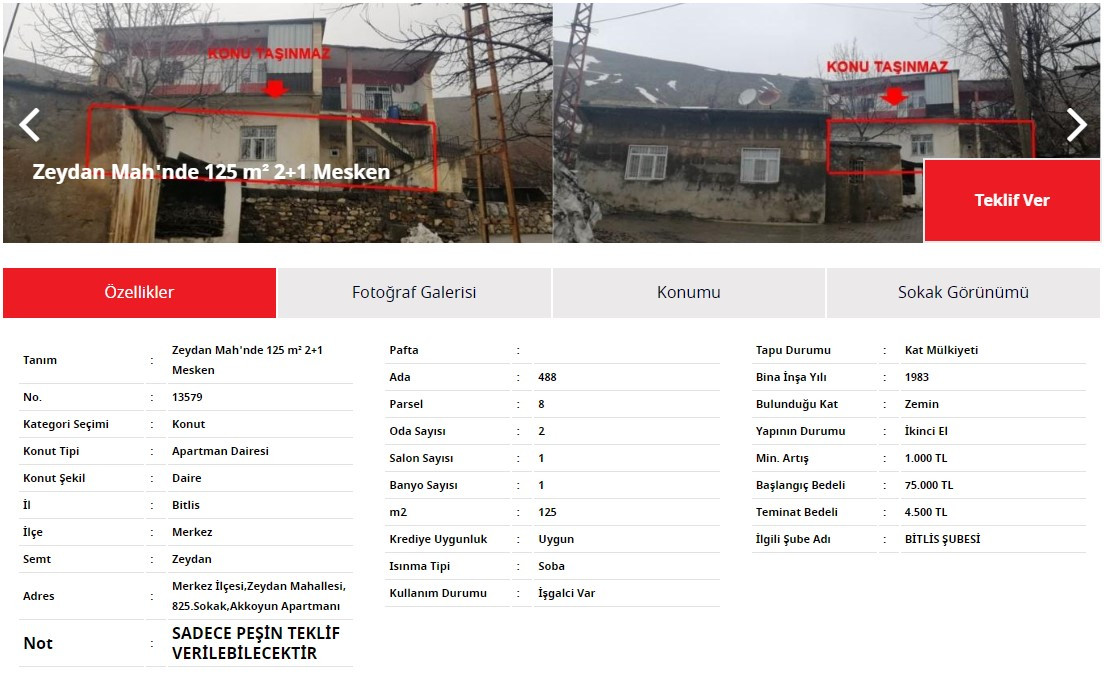 Yayımlanan ilanlarda Türkiye genelinde farklı illerde çok sayıda satılık 2.el ilanına yer alırken mülkiyeti Ziraat Bankası'na geçen evler için vatandaşlara peşin ödeme şartı ile düşük fiyatlar sunuldu. Bitlis Merkez'de yer alan 2+1 ev için belirlenen satış fiyatı 75 bin TL olarak ilanda yer alırken sadece peşin teklif verilebileceği ilan bilgisinde yer aldı.