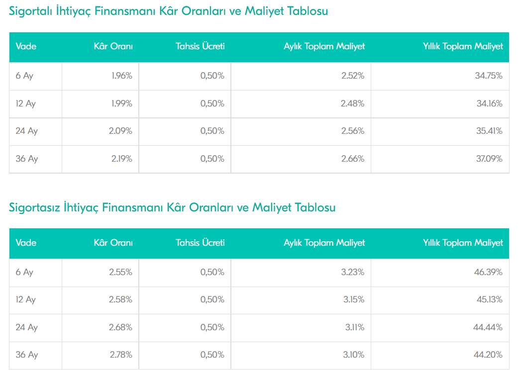 Her iki kredi kullanımında da kredi kullanan kişinin kredi notundan vadeye kadar değişen faiz oranları sunacağını belirten Türkiye Finans Katılım Bankası, sigortalı ihtiyaç kredisinin 6 aylık vadesinde kredilerin yüzde 1, 96 faizden başlayacağını bildirirken; sigortasız ihtiyaç kredisinin 6 aylık vadesinde kredilerin yüzde 2, 55 faizden başlayacağını duyurdu.