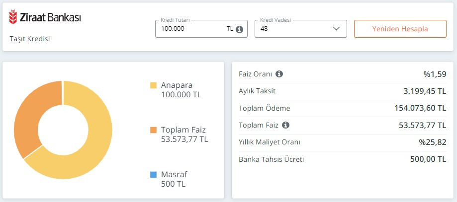 Ziraat Bankası tarafından gelen son bilgiler kapsamında vatandaşların 100 bin TL tutarında taşıt kredisi almaları ve bu krediyi günlük ortalama 100 TL gibi tutarlar ile ödemeleri ön görülüyor. Ziraat Bankası tarafından sunulmuş olan taşıt kredisi kampanyasının detay ve koşulları ise şu şekilde;