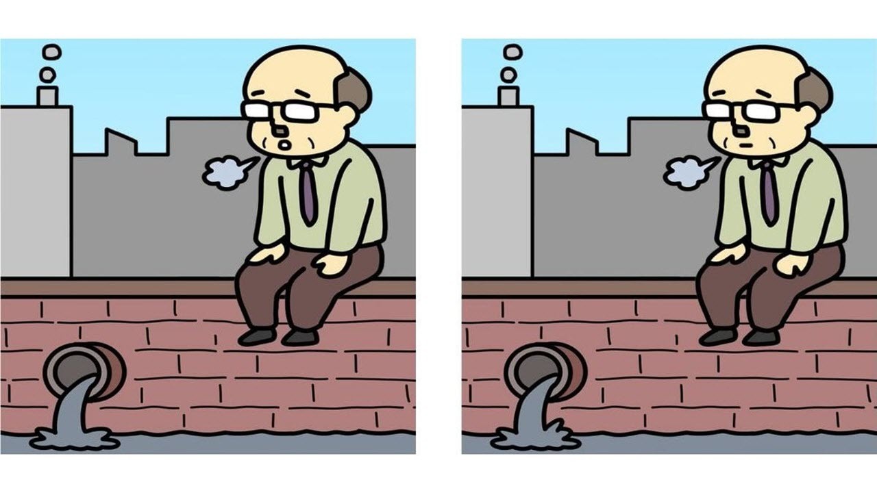 Yukarıdaki resim, duvarda oturan yaşlı bir adamı görebileceğiniz birbirinin aynı iki resmi göstermektedir. Adam yorgun görünüyor ve derin bir iç çekiyor. İki resim hemen hemen aynı olsa da aralarında 3 fark var. Hepsini 9 saniyede bulabilir misin?