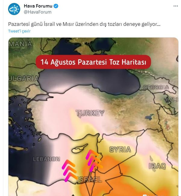 Hava Forum tarafından aktarılan bilgiye göre Pazartesi günü İsrail ve Mısır üzerinden dış tozları deneye geliyor... Cumartesi ve Pazar gününü yolda geçirecek toz bulutları, pazartesinin ilk saatlerinden itibaren Türkiye'ye giriş yapacak ve şehirlerimizde etkili olmaya başlayacak.