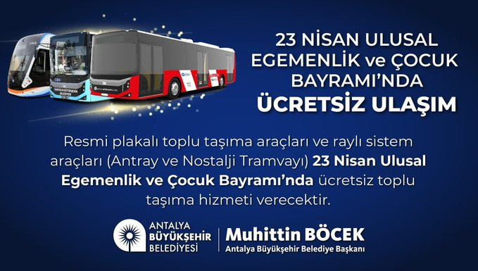 Antalya Büyükşehir Belediyesi, 23 Nisan Ulusal Egemenlik ve Çocuk Bayramı'nda belediyeye ait toplu ulaşım araçlarının ücretsiz yolcu taşıması kararı aldı. 23 Nisan Salı günü belediyenin resmi plakalı otobüsleri, ANTRAY ve nostalji tramvayı vatandaşların kutlamalara rahat ulaşım sağlamaları ve bayramı coşkuyla kutlamaları için ücretsiz hizmet verecek.