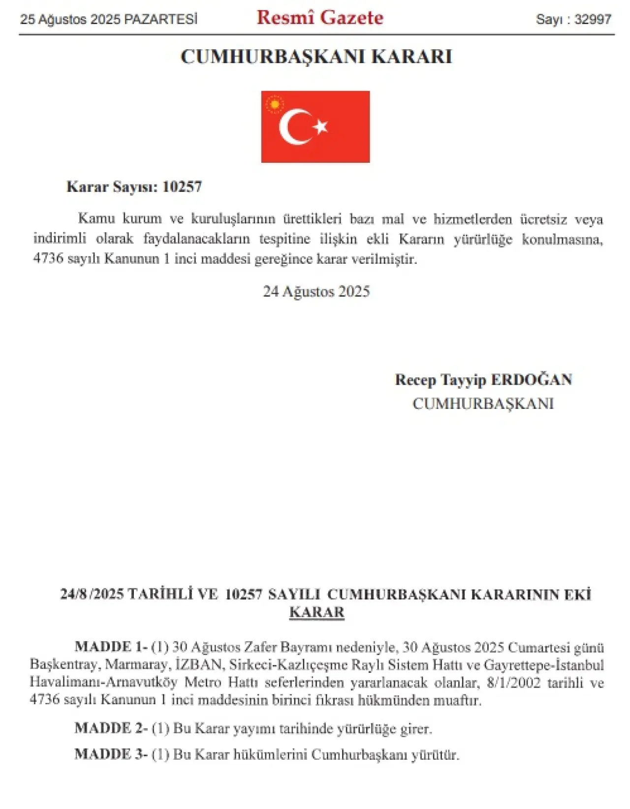 Resmî Gazete’de yayımlanan Cumhurbaşkanı Kararı'nda 30 Ağustos Zafer Bayramı dolayısıyla belirli raylı sistem ve metro hatlarında ulaşımın ücretsiz sağlanacağı belirtildi.