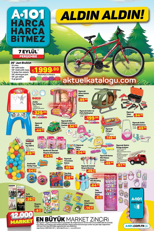 A101 Market, 7 Eylül 2023 tarihinden itibaren geçerli olacak yeni aktüel ürünler kataloğunu yayımladı. Katalog, elektronik ürünlerden beyaz eşyalara, ev ürünlerinden gıda ve temizlik ürünlerine kadar geniş bir yelpazede cazip fırsatları içeriyor. Toshiba'dan Philips'e, dikiş makinelerinden cep telefonlarına kadar birçok ürün, bu kampanyada yer alıyor. Ayrıca, beyaz eşyalar, bisikletler, ev dekorasyon ürünleri ve çok daha fazlası da bu katalogda indirimli fiyatlarla...
