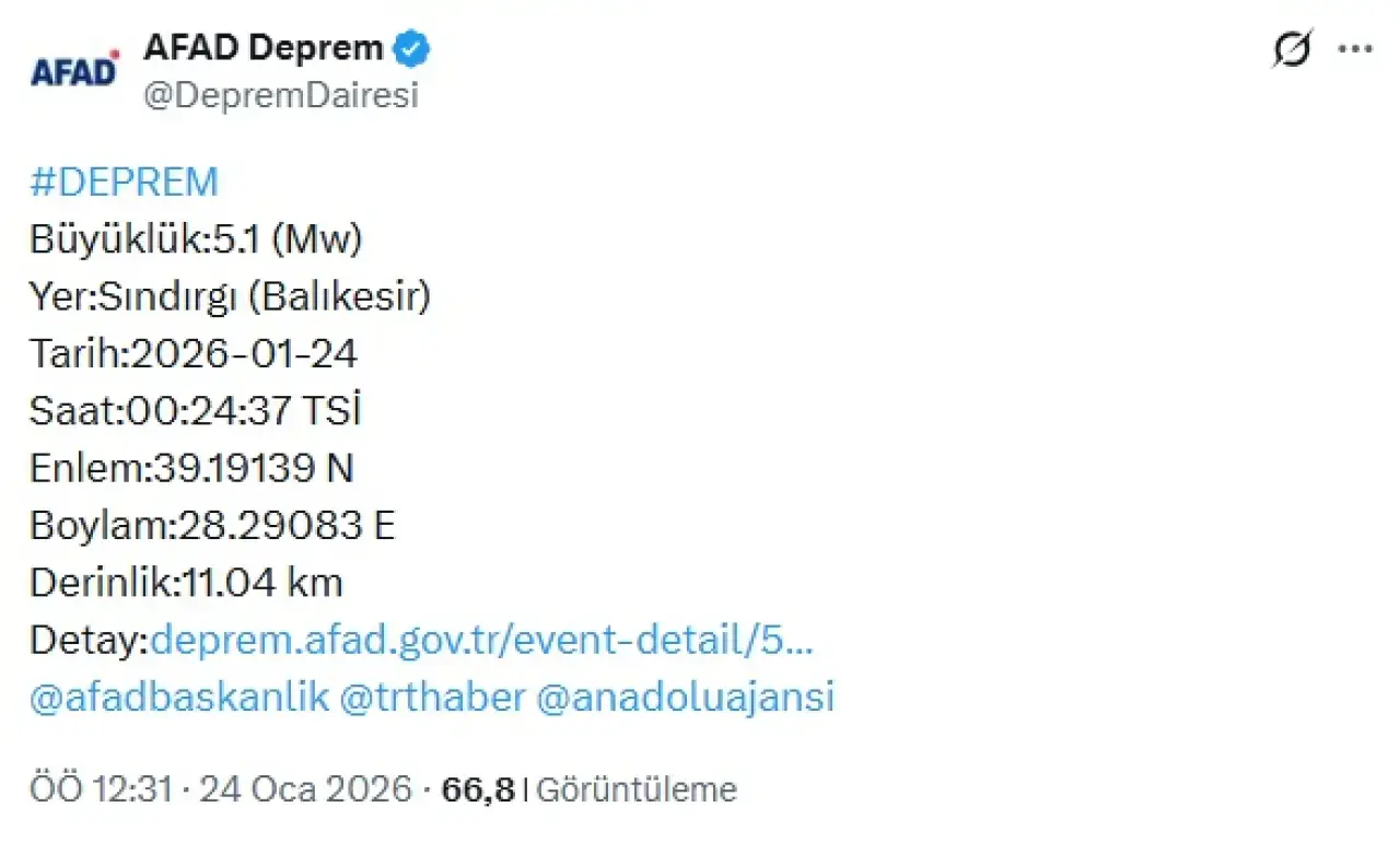 AFAD tarafından yapılan ilk açıklamada, “Balıkesir ilimizin Sındırgı ilçesinde, saat 00.24’te 5.1 büyüklüğünde bir deprem meydana geldi. Gelişmeleri takip etmekteyiz.” denildi.