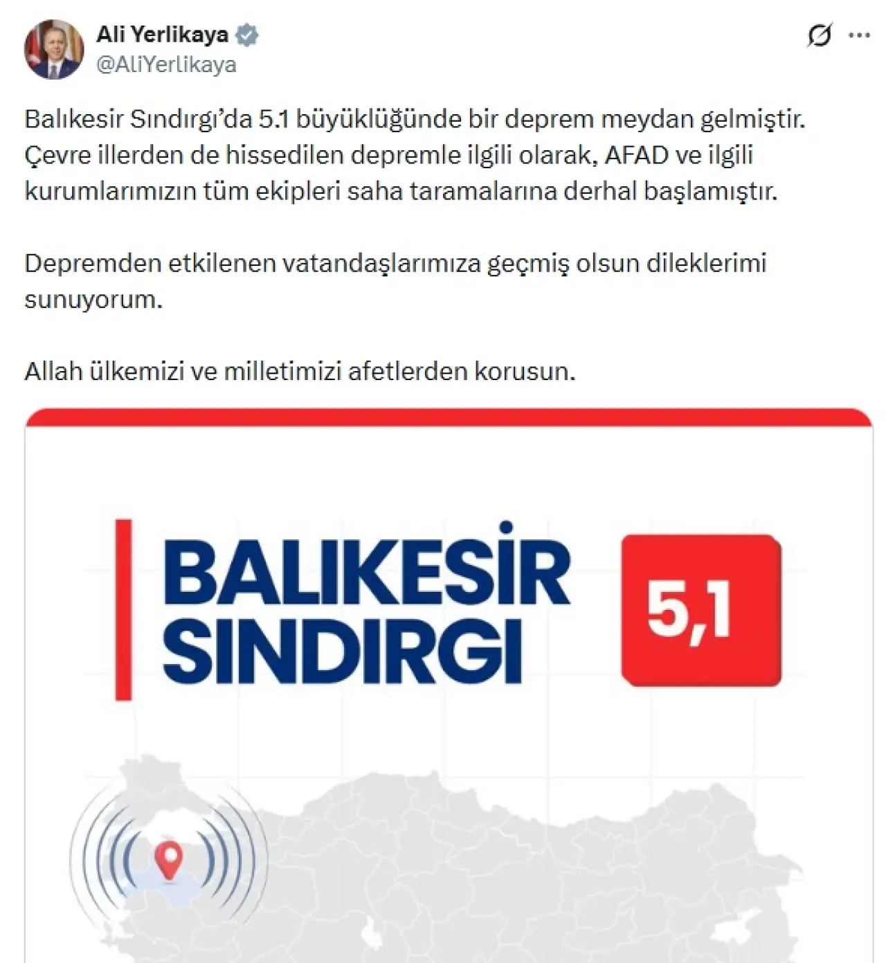 İçişleri Bakanı Ali Yerlikaya da sosyal medya platformu X hesabından yaptığı açıklamada, “Balıkesir Sındırgı’da 5.1 büyüklüğünde bir deprem meydan gelmiştir. Çevre illerden de hissedilen depremle ilgili olarak, AFAD ve ilgili kurumlarımızın tüm ekipleri saha taramalarına derhal başlamıştır. Depremden etkilenen vatandaşlarımıza geçmiş olsun dileklerimi sunuyorum. Allah ülkemizi ve milletimizi afetlerden korusun.” ifadelerini kullandı.