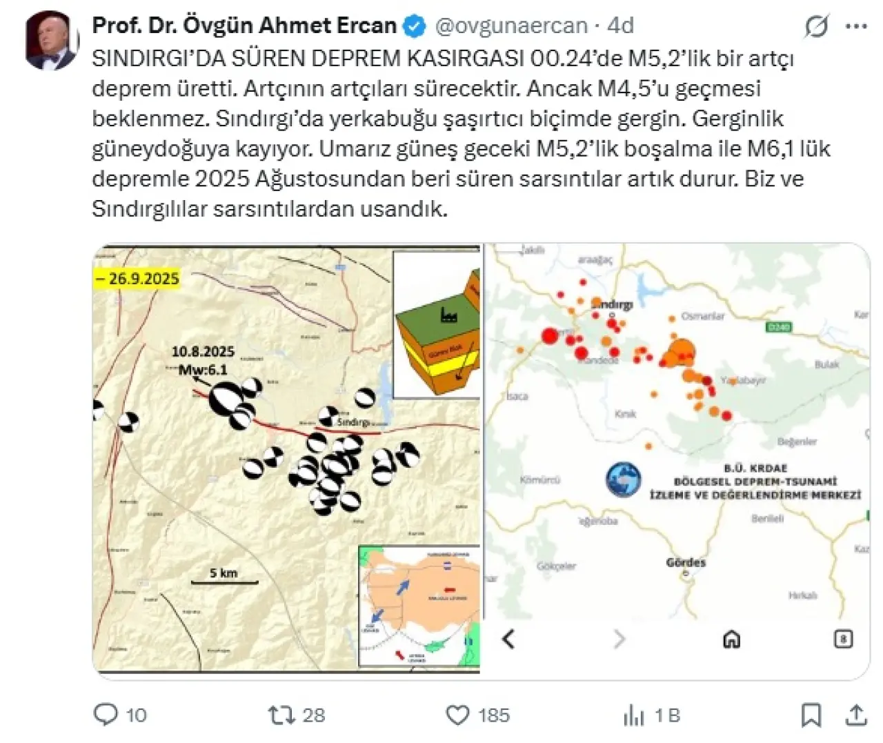 Sındırgı'da meydana gelen 5.1'lik son depremin ardından Jeofizik Yüksek Mühendisi Prof. Dr. Övgün Ahmet Ercan'dan ilk değerlendirme geldi. Sosyal medya platformu X hesabından paylaşımda bulunan Ahmet Ercan, “Sındırgı’da süren deprem kasırgası. 00.24’de M5,2’lik bir artçı deprem üretti. Artçının artçıları sürecektir. Ancak M4,5’u geçmesi beklenmez. Sındırgı’da yerkabuğu şaşırtıcı biçimde gergin. Gerginlik güneydoğuya kayıyor. Umarız güneş geceki M5,2’lik boşalma ile M6,1 lük depremle 2025 Ağustosundan beri süren sarsıntılar artık durur. Biz ve Sındırgılılar sarsıntılardan usandık.” açıklamasında bulundu.