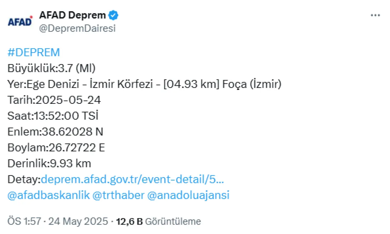 AFAD’tan yapılan son dakika açıklamasına göre, Ege Denizi İzmir Foça açıklarında 3.7 büyüklüğünde deprem oldu.