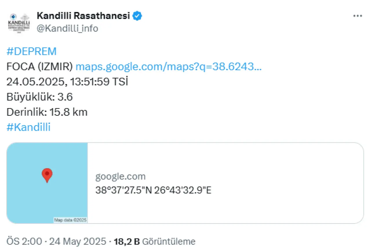 Kandilli Rasathanesi verilerine göre ise 15.8 kilometre derinlikte meydana gelen depremin büyüklüğü 3.6 olarak kaydedildi.
