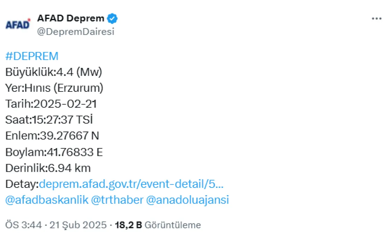 AFAD son depremler verisine göre, Erzurum'un Hınıs ilçesinde Hınıs’ta 4.4 büyüklüğünde bir deprem meydana geldi.
