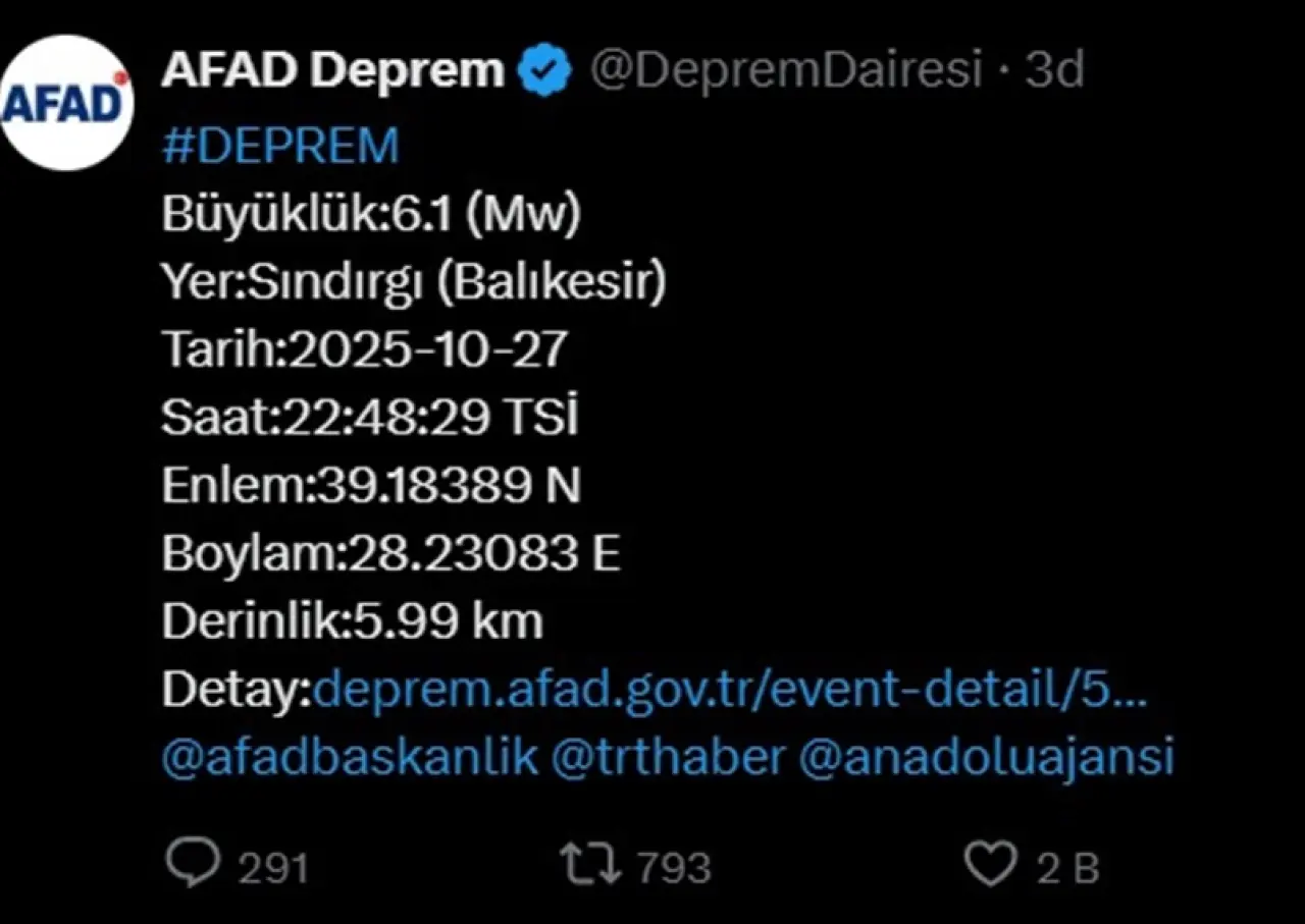 AFAD son depremler verisine göre, saat 22.48'de merkez üssü Balıkesir'in Sındırgı ilçesi olan 6.1 büyüklüğünde deprem meydana geldi.