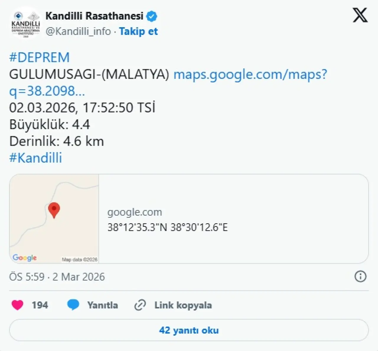 Bir diğer açıklama da Kandilli Rasathanesi ve Deprem Araştırma Enstitüsü'nden geldi. Kandilli Rasathanesi, depremin büyüklüğünü 4.4 olarak açıkladı.