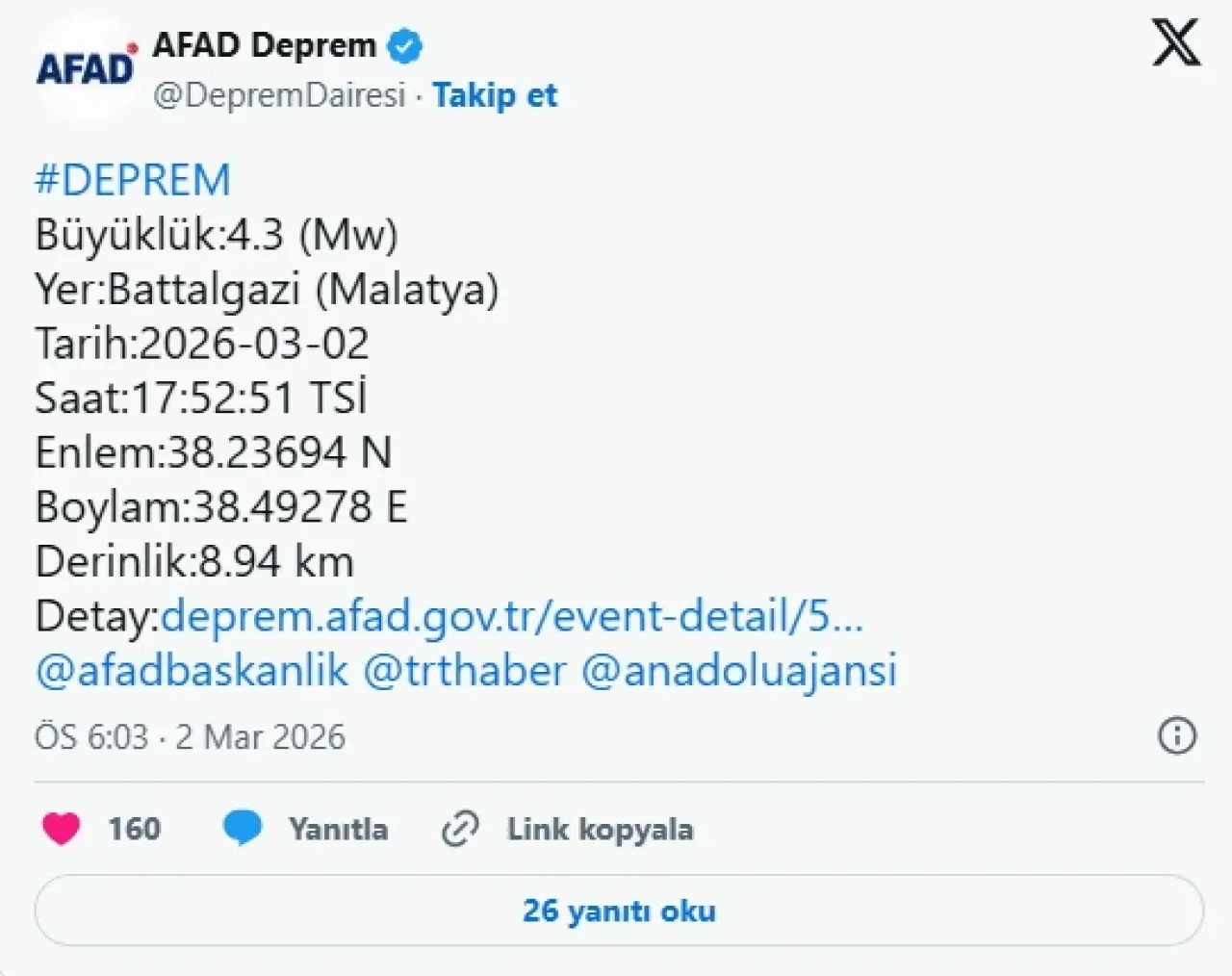 AFAD son depremler verilerine göre, saat 17.52'de yaşanan depremin derinliği ise 8.9 km kilometre olarak ölçüldü.
