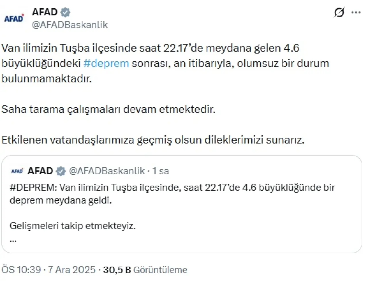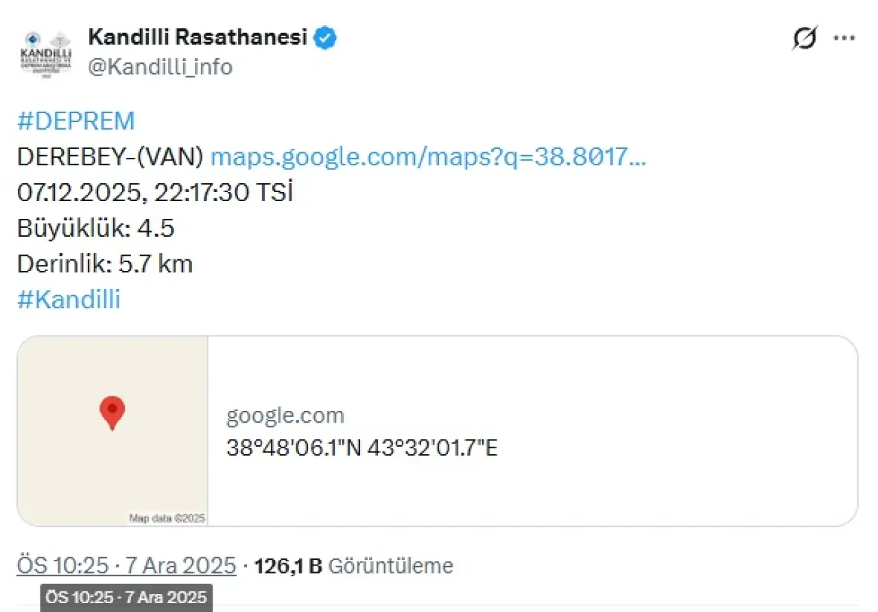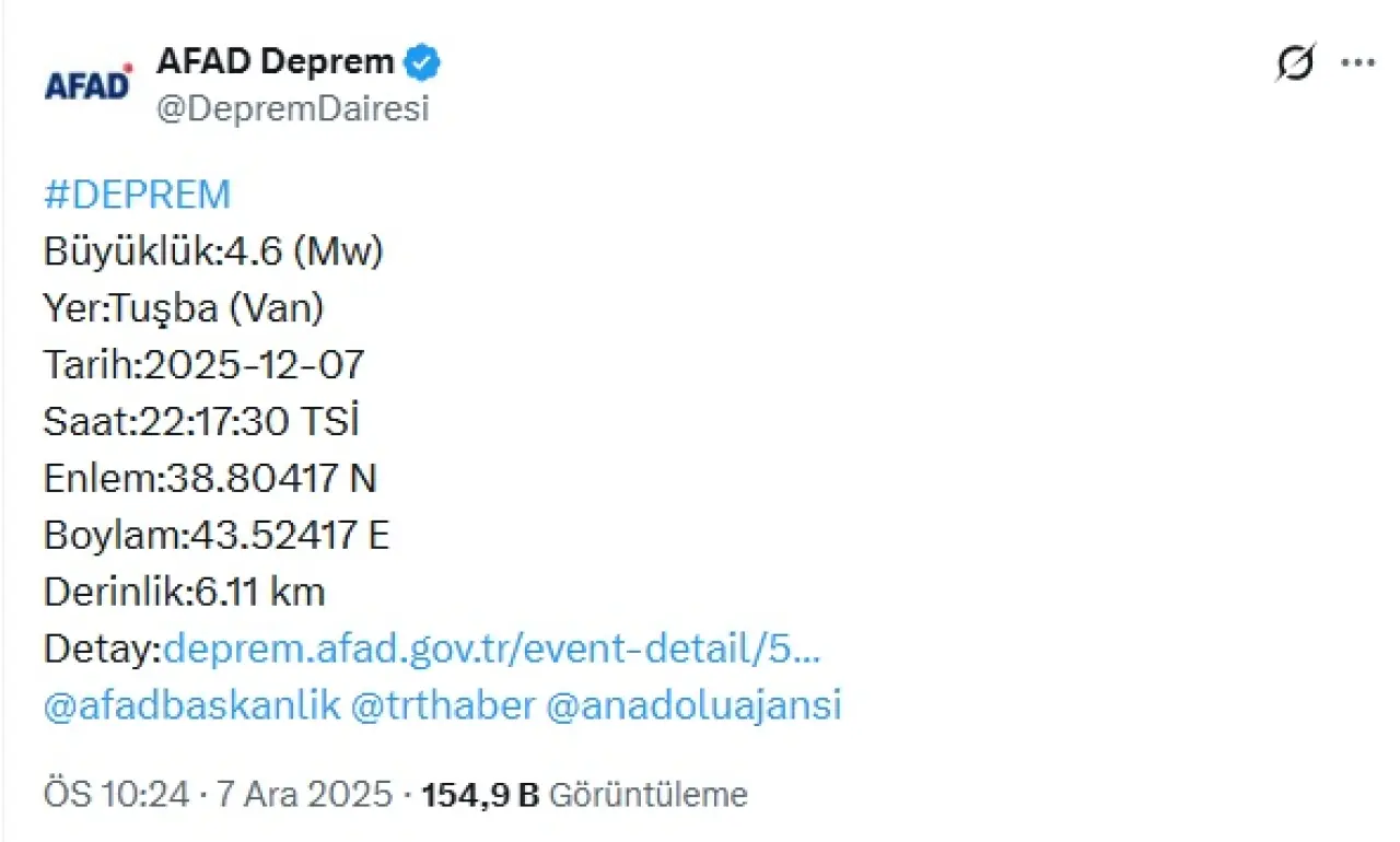 Doğu Anadolu Bölgesi gece saatlerinde hareketli dakikalar yaşadı. Afet ve Acil Durum Yönetimi Başkanlığı (AFAD), Deprem Dairesi, merkez üssü Van'ın Tuşba ilçesinde bir deprem meydana geldi. AFAD, korkutan son depremin detaylarını paylaştı.