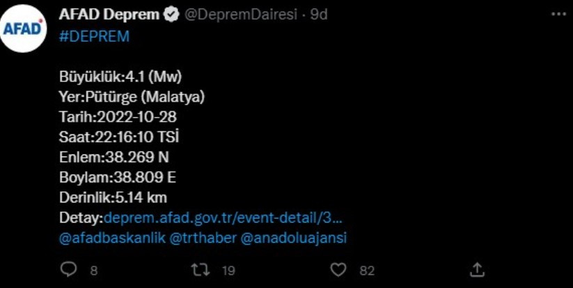 AFAD tarafından yapılan açıklamada depremin olduğu saat 22:16 olarak ilan edilirken depremin merkez üssü Pütürge Malatya Battalgazi olarak belirtildi. Yerin 5, 14 km derinliğinden meydana gelen deprem bir kere daha Malatyalıların panik ve korku yaşamasına neden oldu. Gelen ilk bilgilere göre olumsuz bir durum yaşanmadığı ve deprem nedeni ile yaralanan kişi ya da yıkılan, hasar gören bir yapı olmadığı duyuruldu. Deprem sonrasında yaşanan panik kısa sürede sona ererken sosyal medyada yapılan paylaşımları ile Malatyalılar üst üste yaşanan depremler nedeniyle yaşadıkları tedirginliği ifade ettiler.