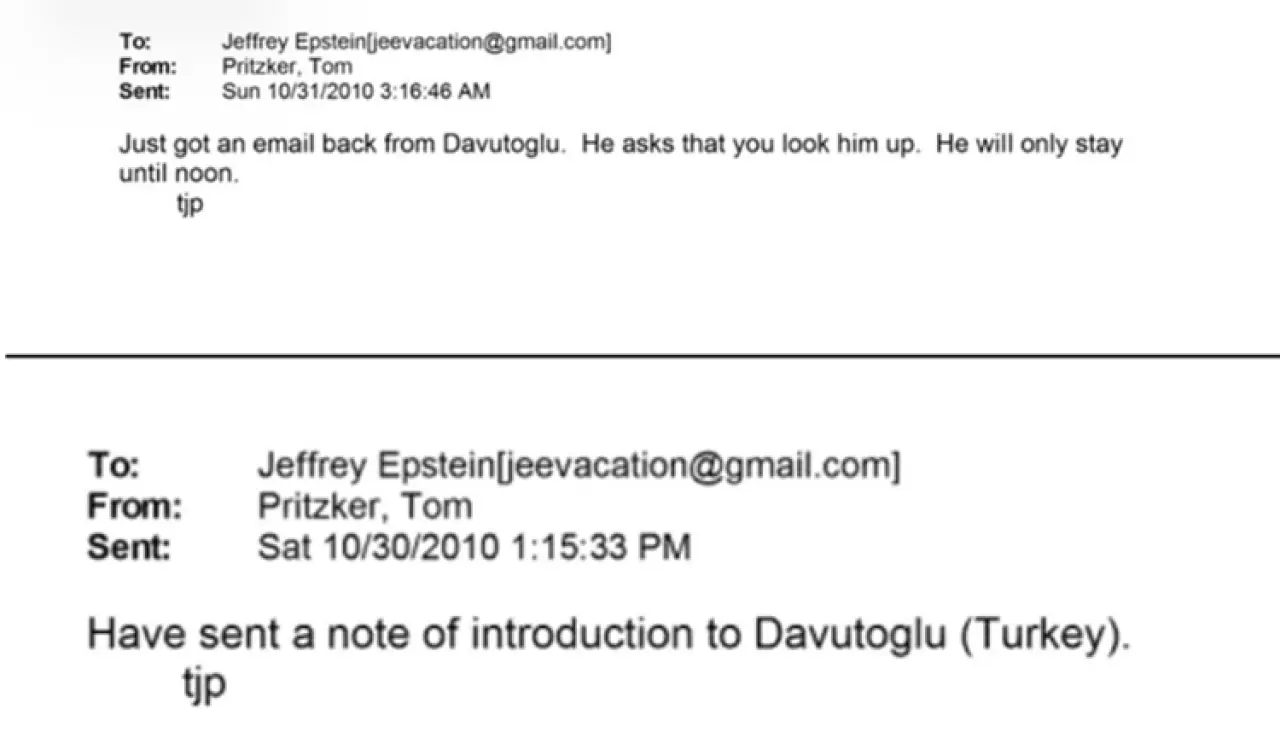 Epstein belgelerinde ismi geçenler arasında 2010 yılında Epstein'e atılan bir e-postada dönemin başkanı Ahmet Davutoğlu'nun ismi de geçiyor. İş insani Thomas Pritzker'ın Jeffrey Epstein yolladığı e-postada, “Davutoğlu'nu (Türkiye) tanıtan bir not yolladım sana.” ifadeleri yer alıyor. Pritzker, bu e-postadan bir gün sonra, Epstein'e, “Az öce Davutoğlu'dan bir e-posta aldım. Senin temasa geçmeni istiyor. Sadece öğlene kadar kalacak.” mesajını atıyor.