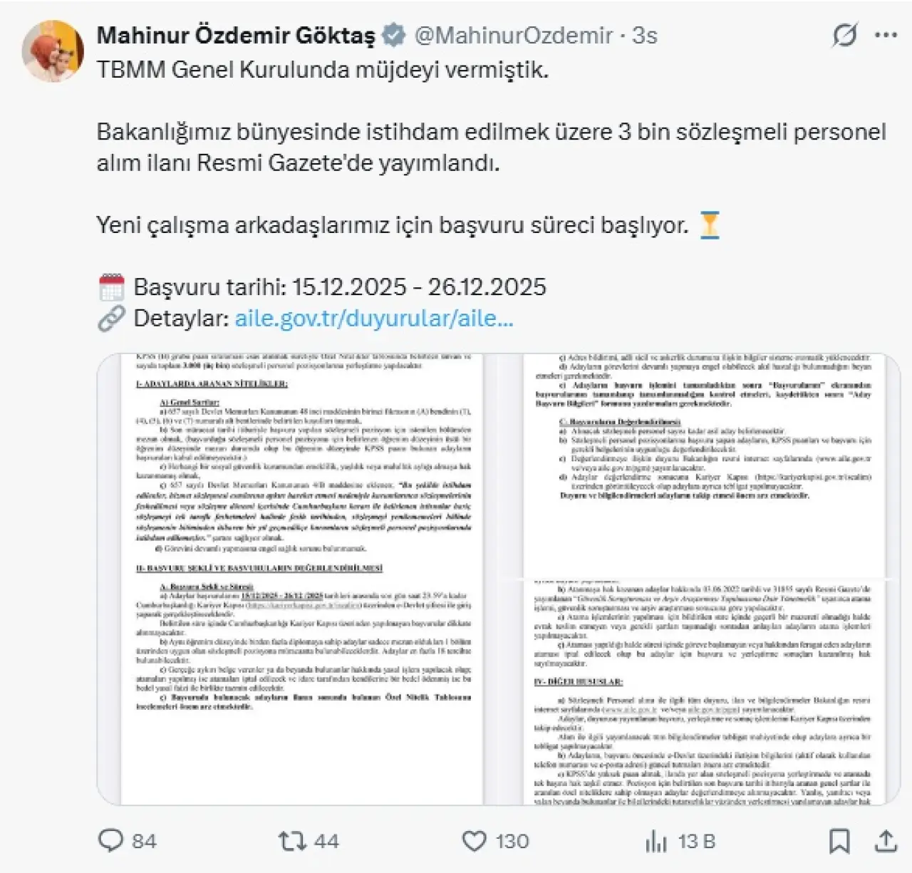 Aile ve Sosyal Hizmetler Bakanı Mahinur Özdemir Göktaş, ilanın yayımlanmasının ardından sosyal medya platformu X hesabından bir paylaşım yaptı. Bakan Göktaş, “TBMM Genel Kurulu’nda müjdeyi vermiştik. Bakanlığımız bünyesinde istihdam edilmek üzere 3 bin sözleşmeli personel alım ilanı Resmi Gazete'de yayımlandı. Yeni çalışma arkadaşlarımız için başvuru süreci başlıyor.” ifadelerini kullandı.