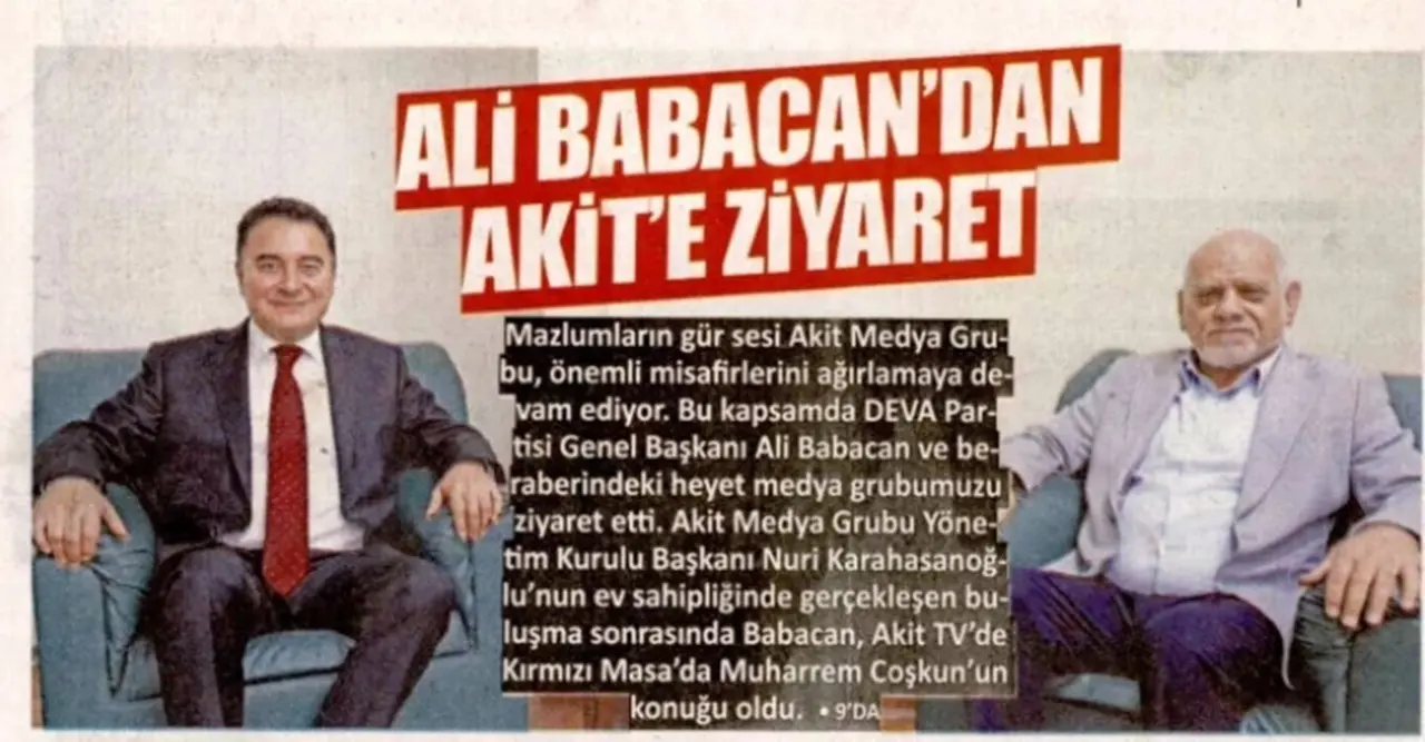 İddia sosyal medyada dillendirilmeye devam ederken Babacan'dan sürpriz bir hamle geldi. Yeni Akit Gazetesi Yönetim Kurulu Başkanı Nuri Karahasanoğlu'nu makamında ziyaret etti, daha sonrasında ise Akit TV'de ‘Kırmızı Masa’ programa katıldı.