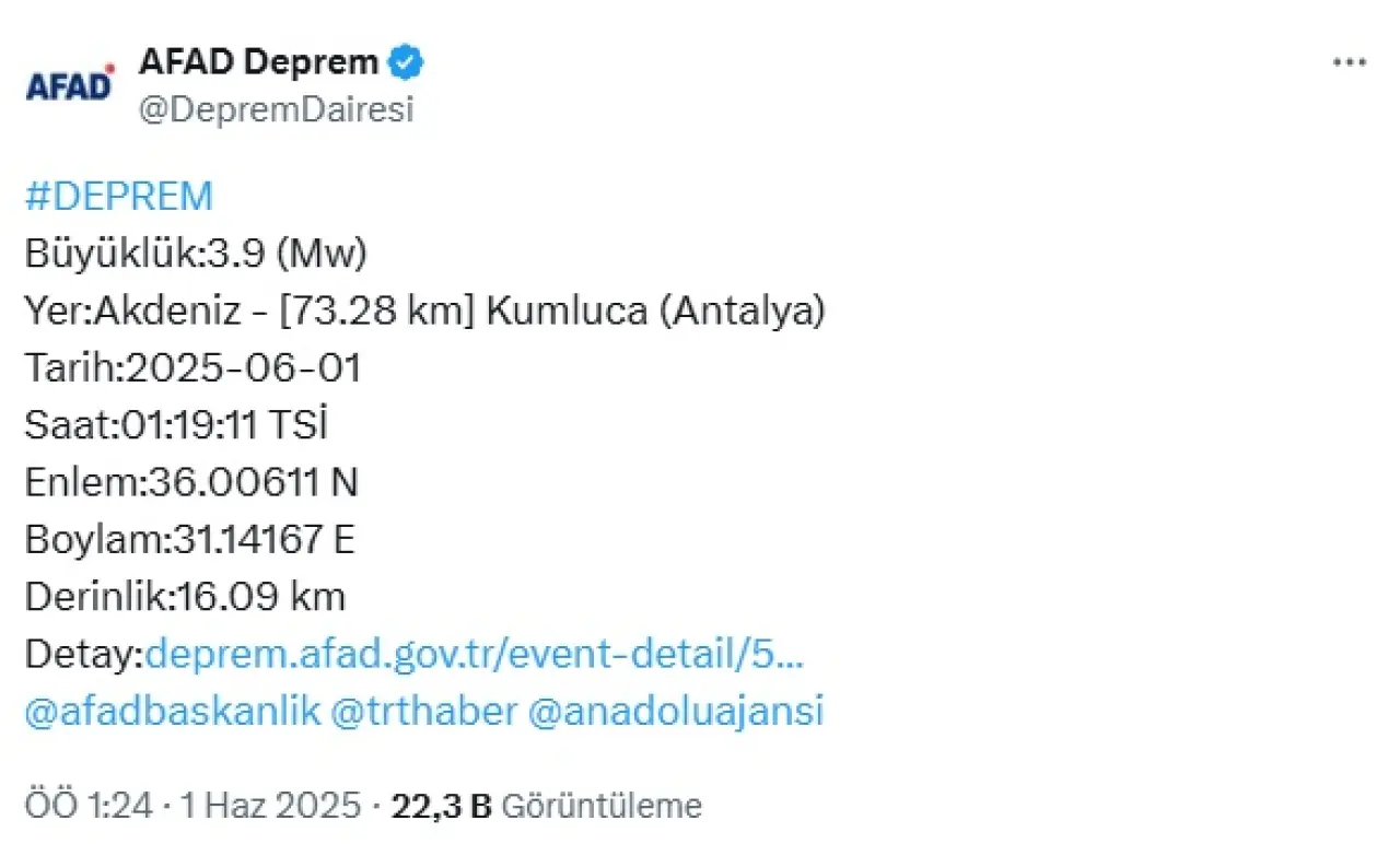 AFAD Deprem Dairesi, gece yarısı 01.19’da Akdeniz Antalya Kumluca açıklarında 3.9 büyüklüğüne bir deprem meydana geldiğini duyurdu.