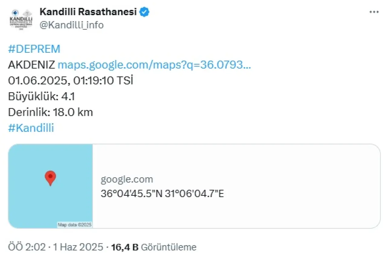 Meydana gelen son deprem 16.09 kilometre derinlikte kaydedildi.