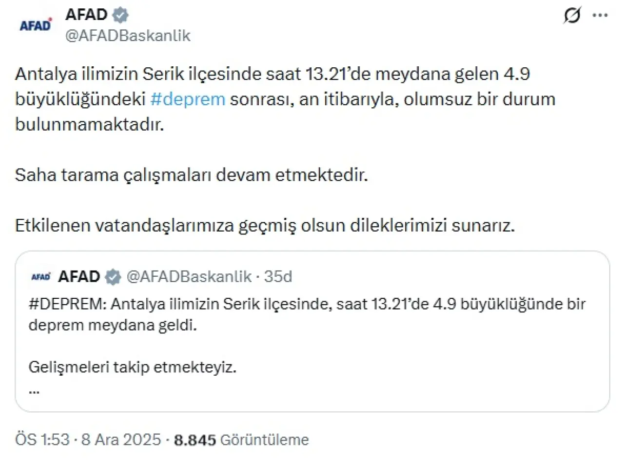 Afet ve Acil Durum Yönetimi Başkanlığı (AFAD) tarafından yapılan açıklamada, “Antalya ilimizin Serik ilçesinde saat 13.21’de meydana gelen 4.9 büyüklüğündeki deprem sonrası, an itibarıyla, olumsuz bir durum bulunmamaktadır. Saha tarama çalışmaları devam etmektedir. Etkilenen vatandaşlarımıza geçmiş olsun dileklerimizi sunarız.” denildi.