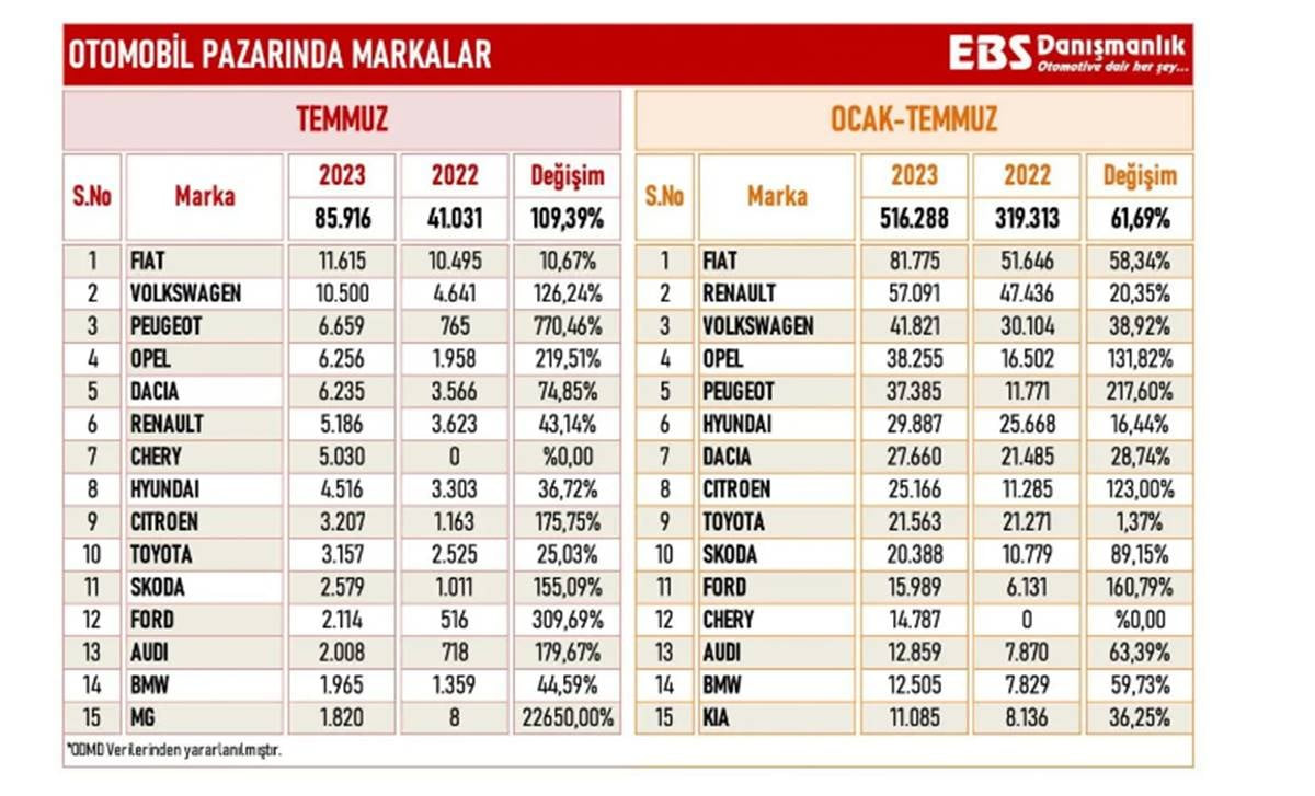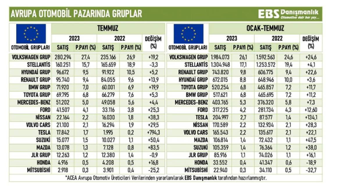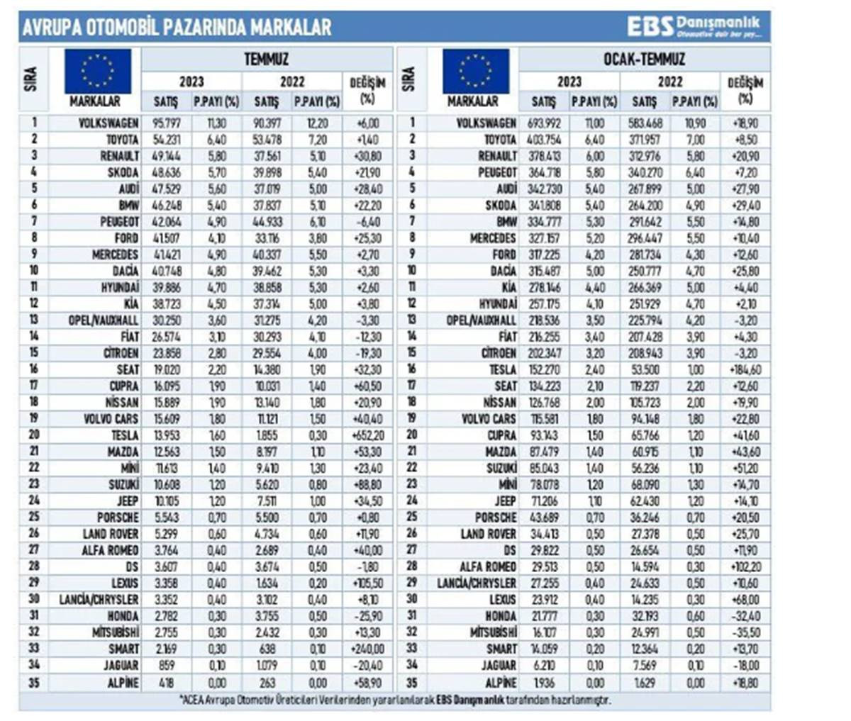 Markalarda Volkswagen ve Toyota ilk 2 sırayı alırken, gruplarda ise Volkswagen ve ardından Stellantis geliyor. Türkiye'de ise ilk 7 ayda markalarda Fiat ve Renault ilk 2 sırayı aldı. Sadece VW temmuz ayında hem Avrupa'da hem Türkiye'de ilk 2 içinde."