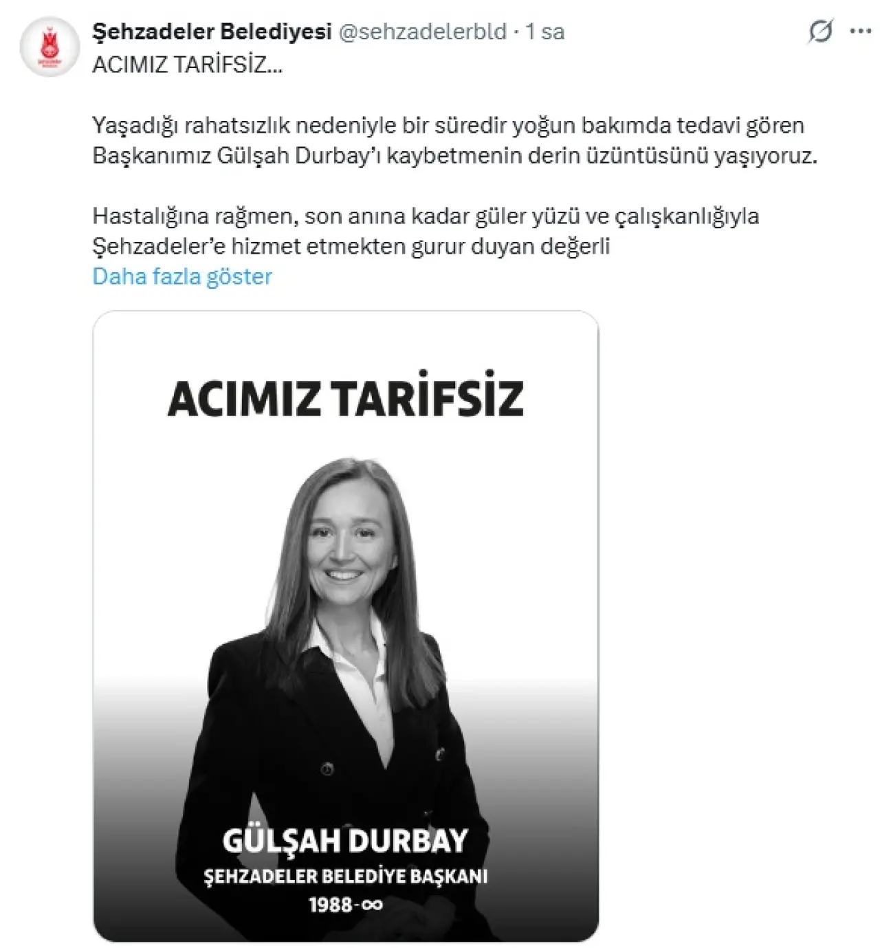 “1 Aralık 2025 tarihinde yatırmış olduğumuz Şehzadeler Belediye Başkanı Gülşah Turgay, 14 Aralık Pazar günü saat 20.00’de hayata veda etti. Bu 14 günlük sürecin 13 gününde yoğun bakımımızda takip ettik. Bugün saat 19.00 civarında kalbi durdu, bir saatlik müdahalemize rağmen yanıt alamadık. Multiorgan yetmezliği ve metastatik kolon kanseri nedeniyle takip ediliyordu. Tıbben ne gerekiyorsa yaptık ama buraya kadarmış. Tüm Manisa’nın, tüm Şehzadeler’in, tüm sevenlerinin başı sağ olsun. Allah rahmet eylesin, mekânı cennet olsun.”